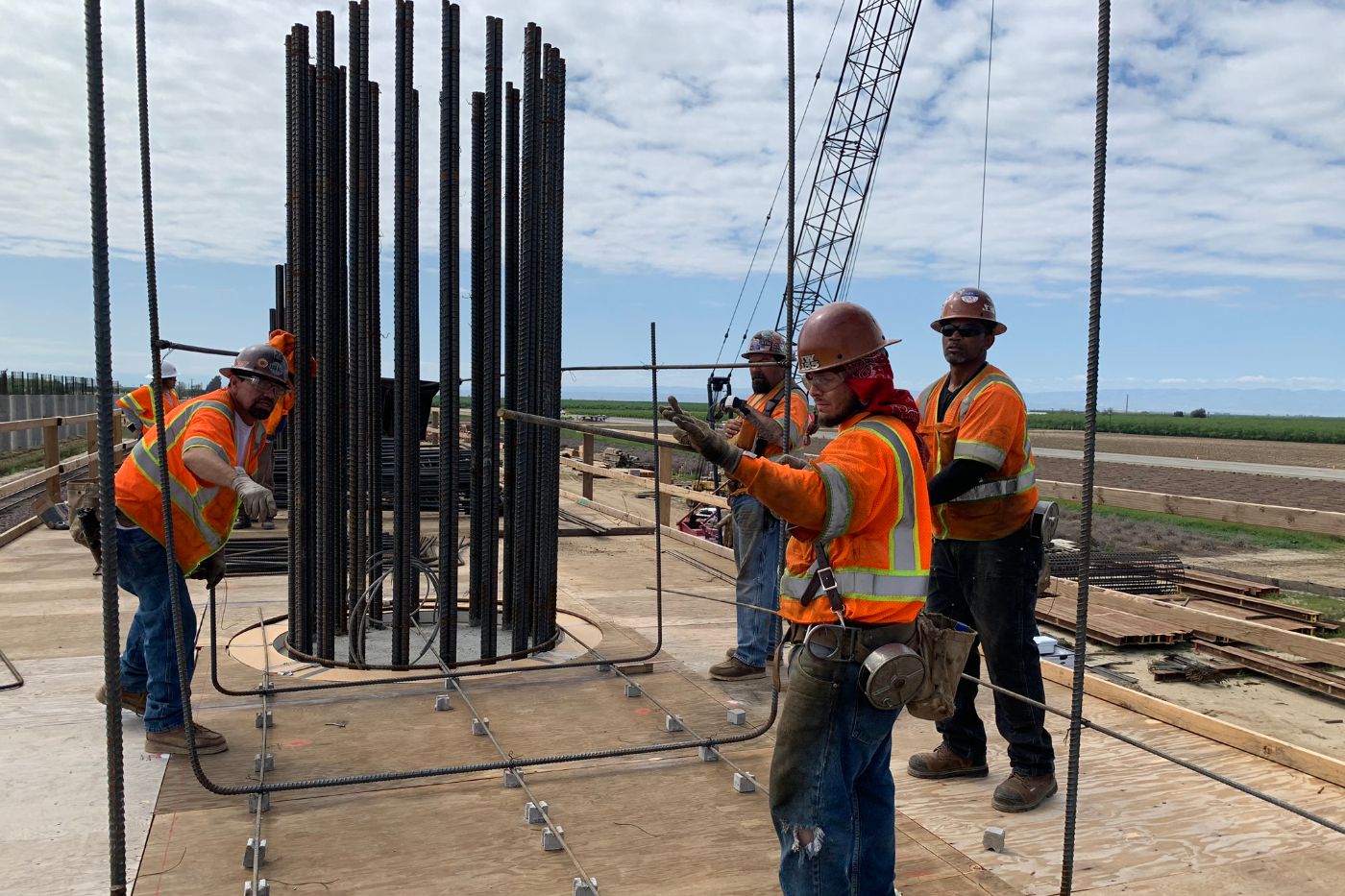 Ironworkers are hard at work at the Wasco Viaduct in Kern County. Crews are continuing to drill shafts where rebar will be placed to form columns for the pergola structure. On top of the deck, ironworkers with Pacific Steel Group are setting horizontal bars to link the stirrups of the girders for the west side of the pergola. When complete, the viaduct and pergola will be nearly 2,000-feet in length.