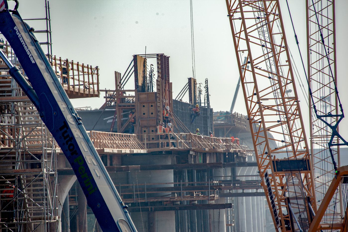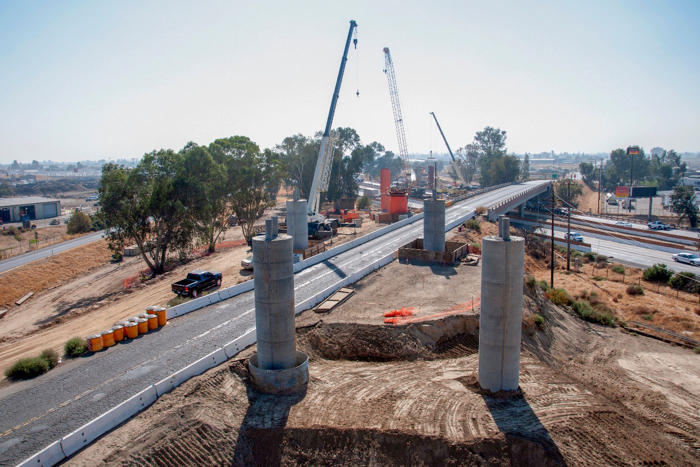 At the Cedar Viaduct, construction crews continue extending the structure across State Route 99 south of Fresno. Columns for several support piers are rising on both sides of the highway. The viaduct will eventually be connected to the smaller Muscat Viaduct a little further to the south. One of the largest structures on Construction Package 1, the Cedar Viaduct will be about three-quarters of a mile long when complete.