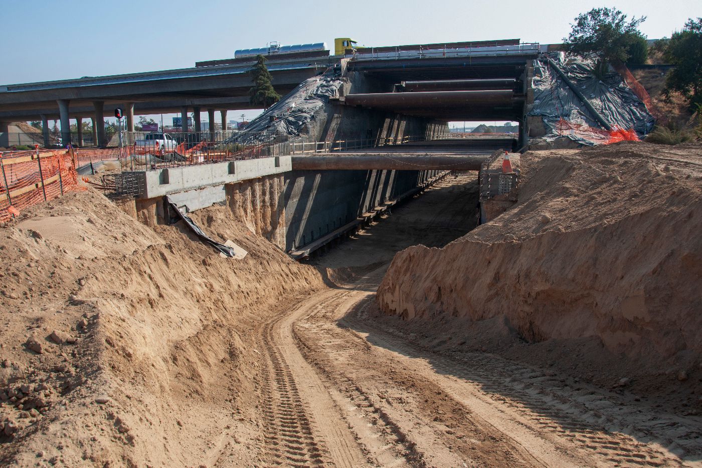 Workers continue excavating the crossing under State Route 180 (SR 180) outside of downtown Fresno. As they dig down five feet, they add to the retaining wall with a rebar mesh and sprayed concrete, known as shotcrete. There’s about 18 feet left to excavate before crews will construct a concrete box that will carry the trains under SR 180, a rail spur and the Dry Creek Canal. At the trench, to the north of the SR 180, additional precast struts have been set, approximately 800 feet have been partially excavated. Crews are installing temporary supports to excavate the remainder in this area of the trench. Ultimately, the trench will extend approximately one mile in length.