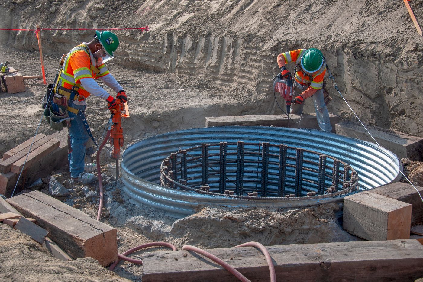 At the overcrossing for Kent Avenue, workers are beginning construction of the bridge deck’s support piers. A rebar cage is lowered into a drilled shaft then filled with concrete. A second rebar cage is attached then concrete forms set to form the column. A flared pier cap will next be constructed on top of the columns to support the bridge deck.