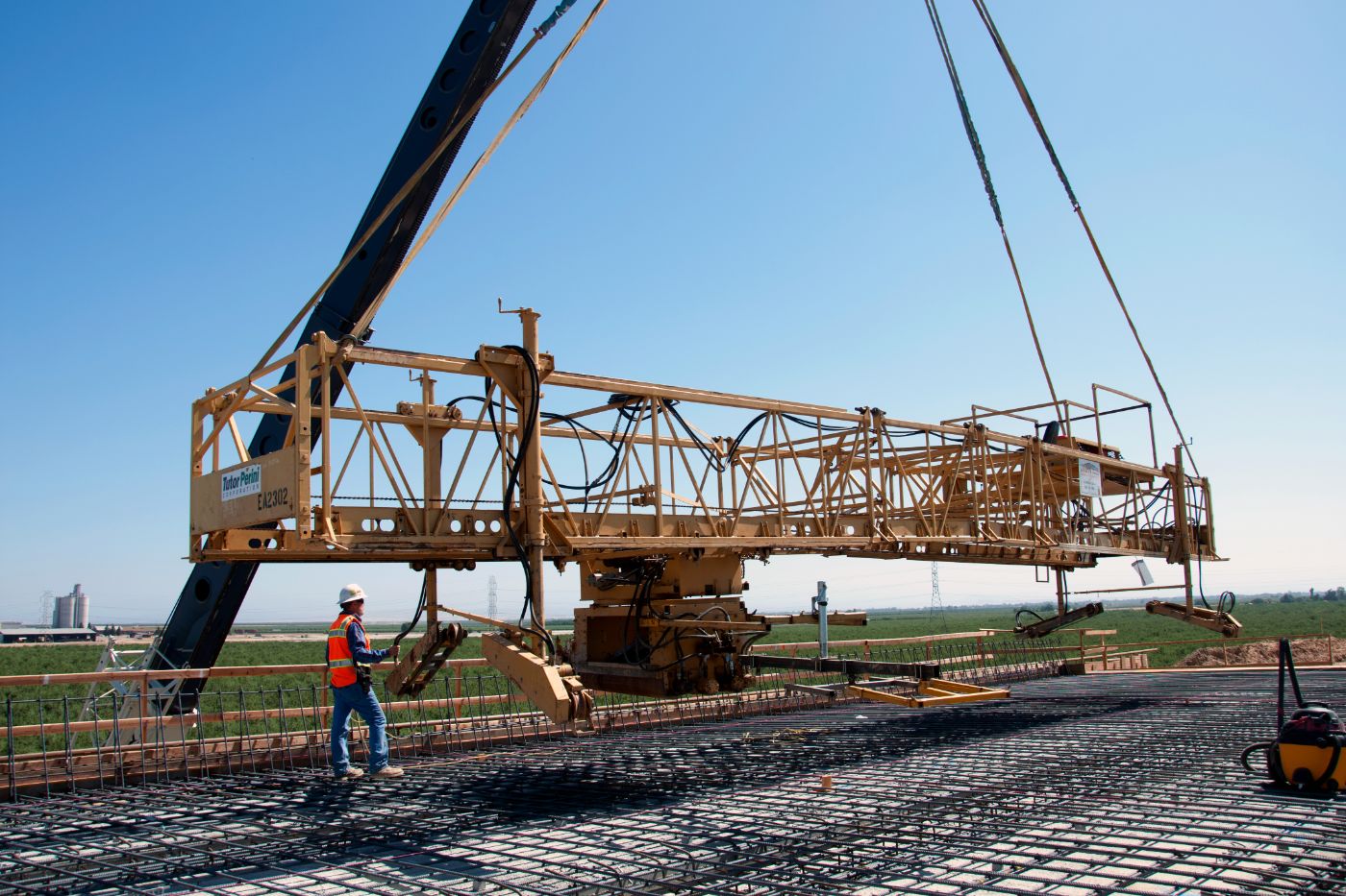 Also in Madera County, crews have constructed the bridge deck for the Avenue 11 overcrossing and are getting it ready for a concrete pour later in July. Pictured above, a crane lifts the paving machine, called a Bidwell, off the deck structure for some routine maintenance. This crossing, a little east of Road 30 ½, will take traffic over the high-speed rail alignment.