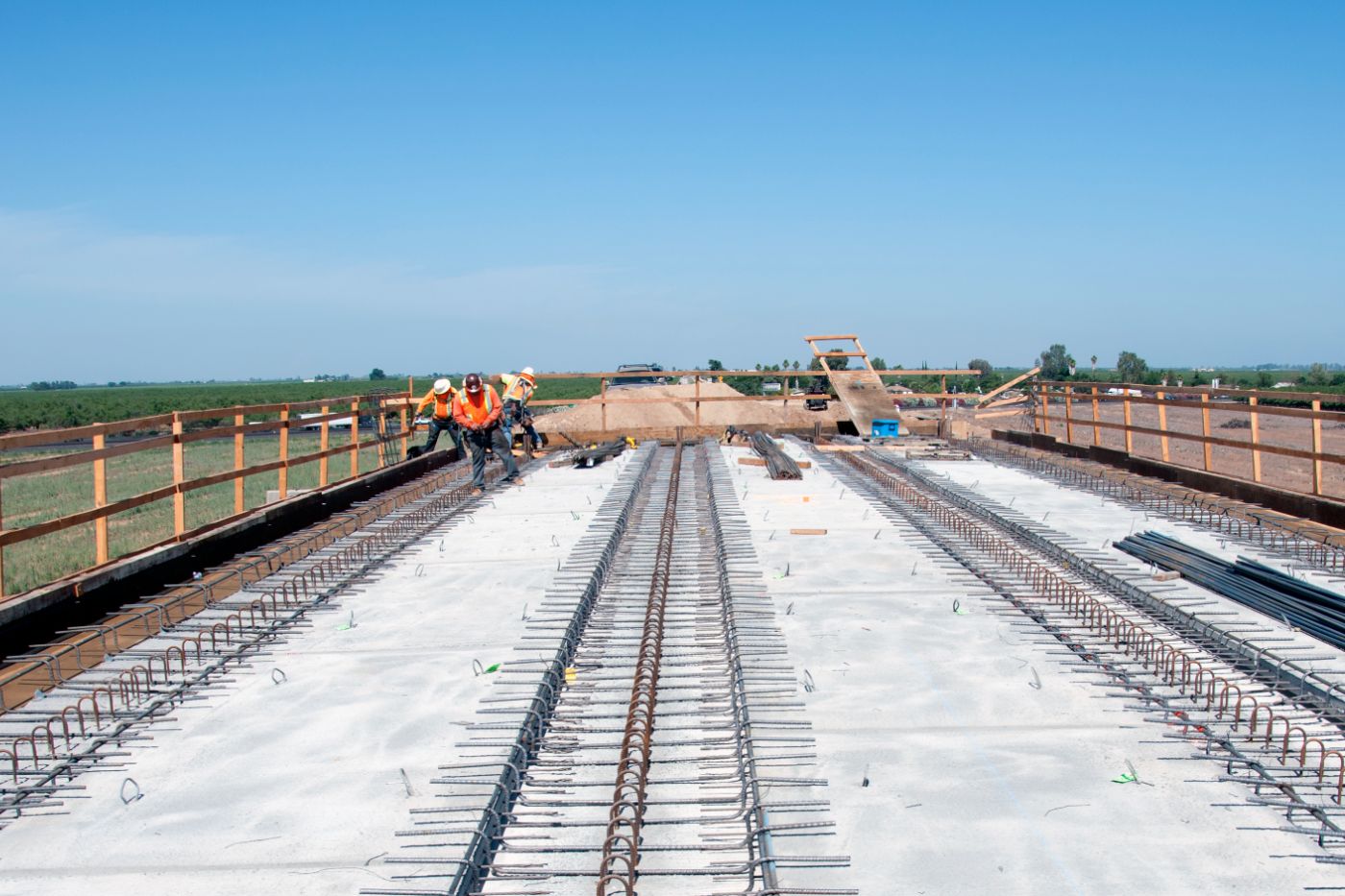 At Avenue 8 in Madera County, the precast deck panels, which act as the underside (or soffit) of the bridge deck, have been set and crews are tying deck rebar for a single span bridge that will cross the high-speed rail alignment east of State Route 99. The block retaining walls have been completed on either side of the abutments and fill dirt placed to finish the slope leading up to the bridge.