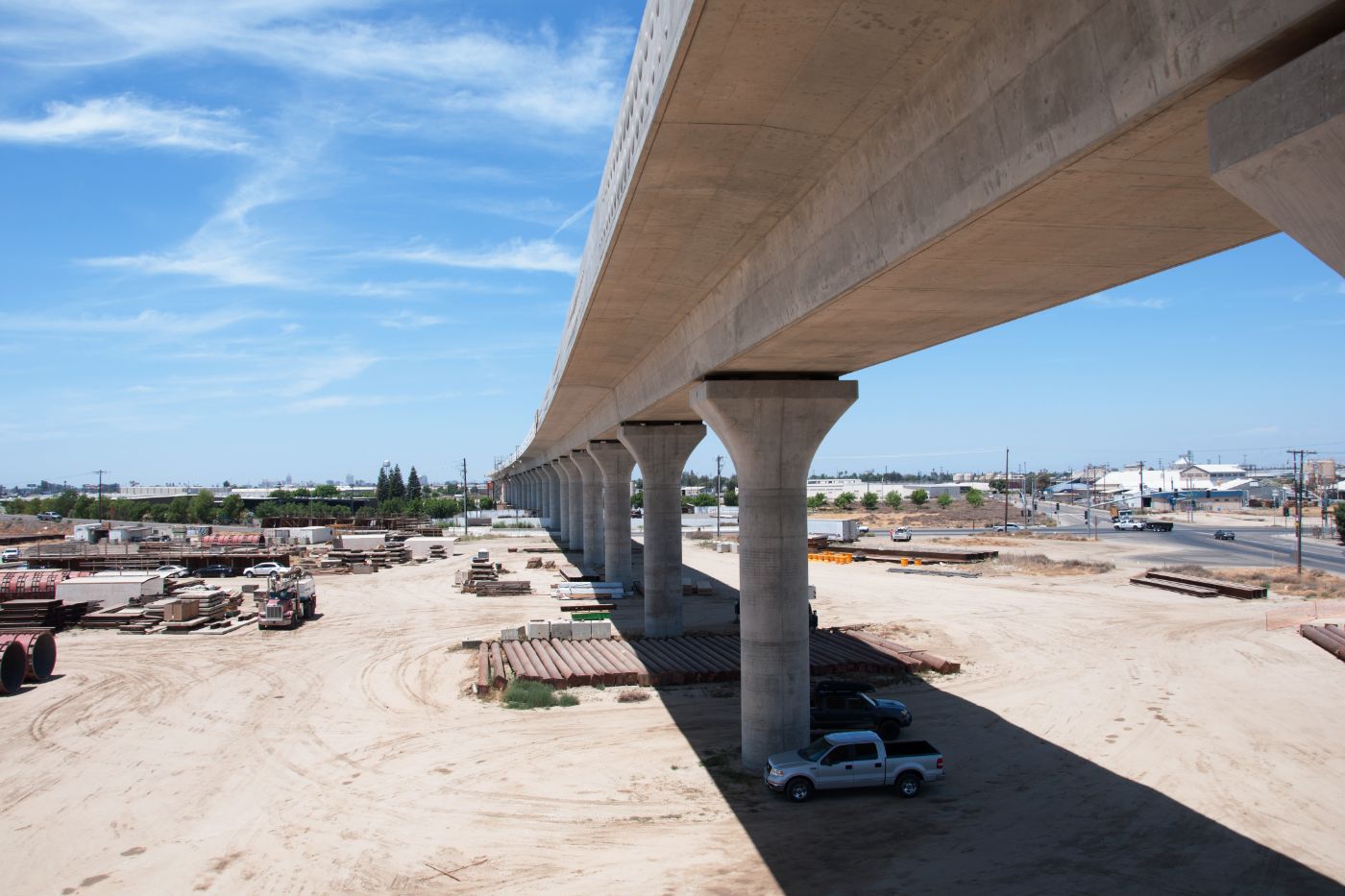 At the Cedar Viaduct, construction crews have begun to extend the structure across State Route 99 (SR 99) south of Fresno. Drilling for support pier foundations is now well underway on either side of the highway and soon will also take place in the highway median. Shafts are being drilled nearly 90 feet deep and will be filled with rebar cages and concrete. The viaduct will eventually be connected to the Muscat Viaduct a little further to the south. One of the largest structures on Construction Package 1, the Cedar Viaduct will be about three-quarters of a mile long when it’s complete.