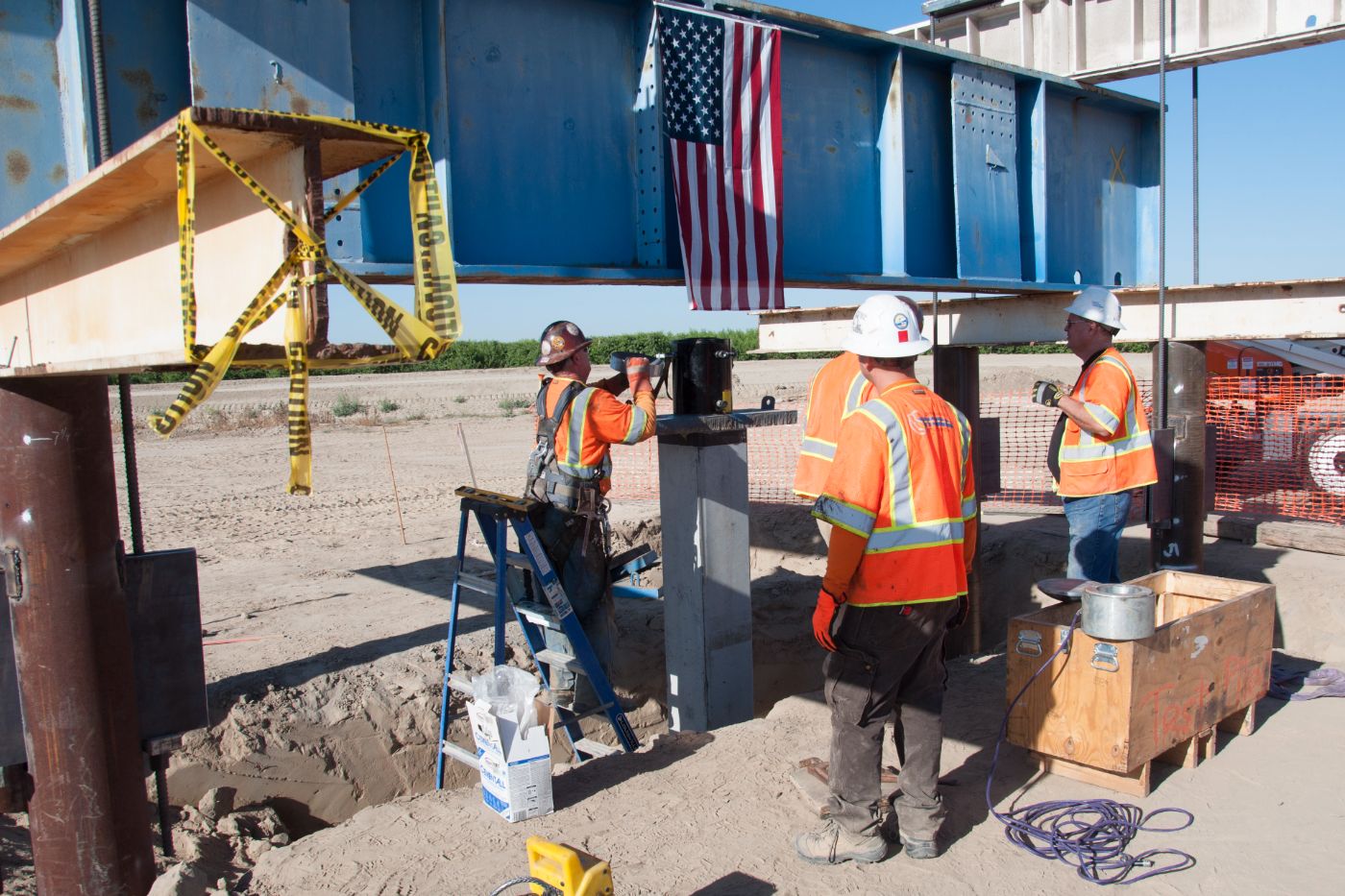 Just west of State Route 43 in south Fresno County, crews conduct geotechnical analysis on test piles for a future overcrossing for Davis Avenue. The test piles are driven into the ground and then subjected to forces to see how the soils react. Designers will use the data collected to determine how to construct the future overcrossing that will take Davis Avenue traffic over the high-speed rail line.