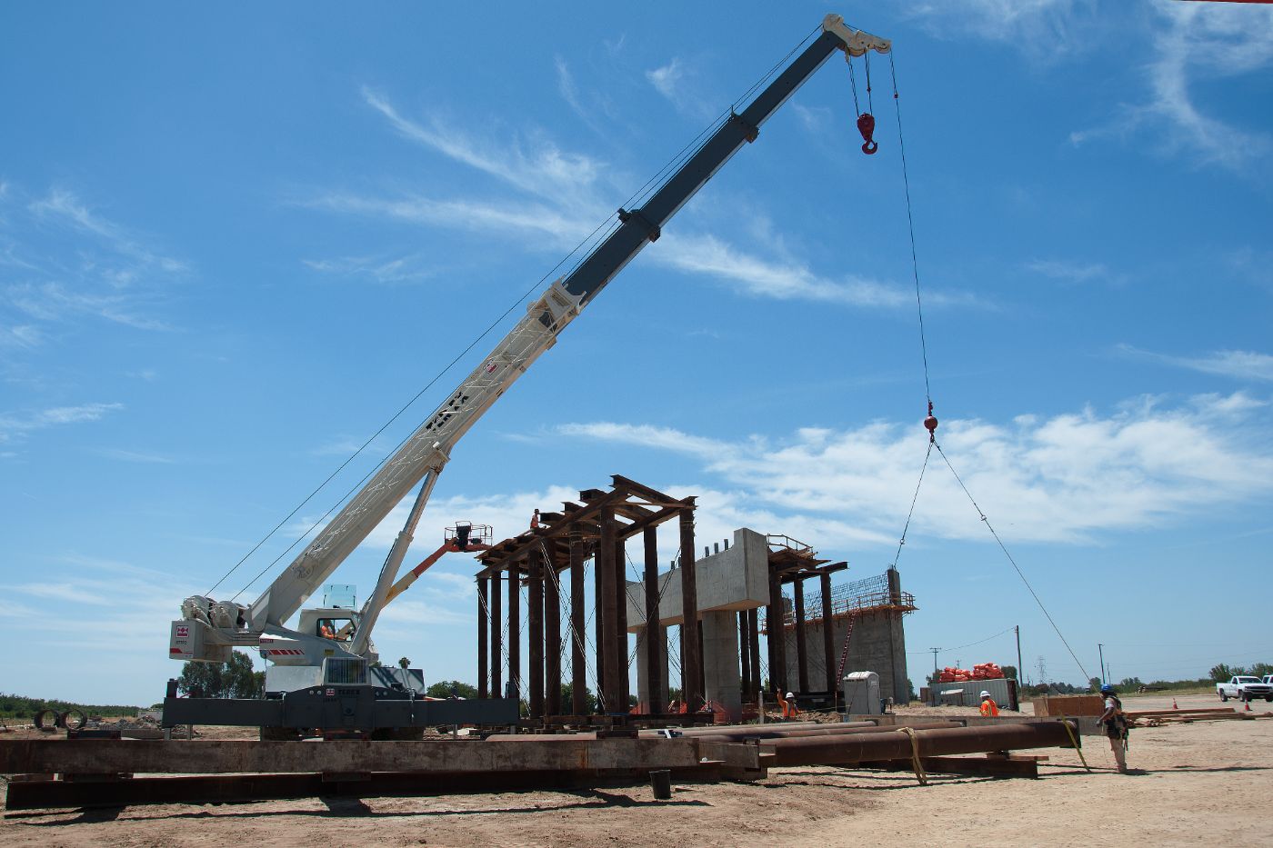 At Avenue 7 and Road 33 in Madera County, a crane set 10 concrete girders to begin construction of the upper portion of the bridge known as the superstructure. Each girder was 110 feet long and weighed about 105,000 pounds. This crossing will straighten out a bend in Avenue 7 while realigning Road 33 and allowing traffic to cross over the high-speed rail tracks east of State Route 99.