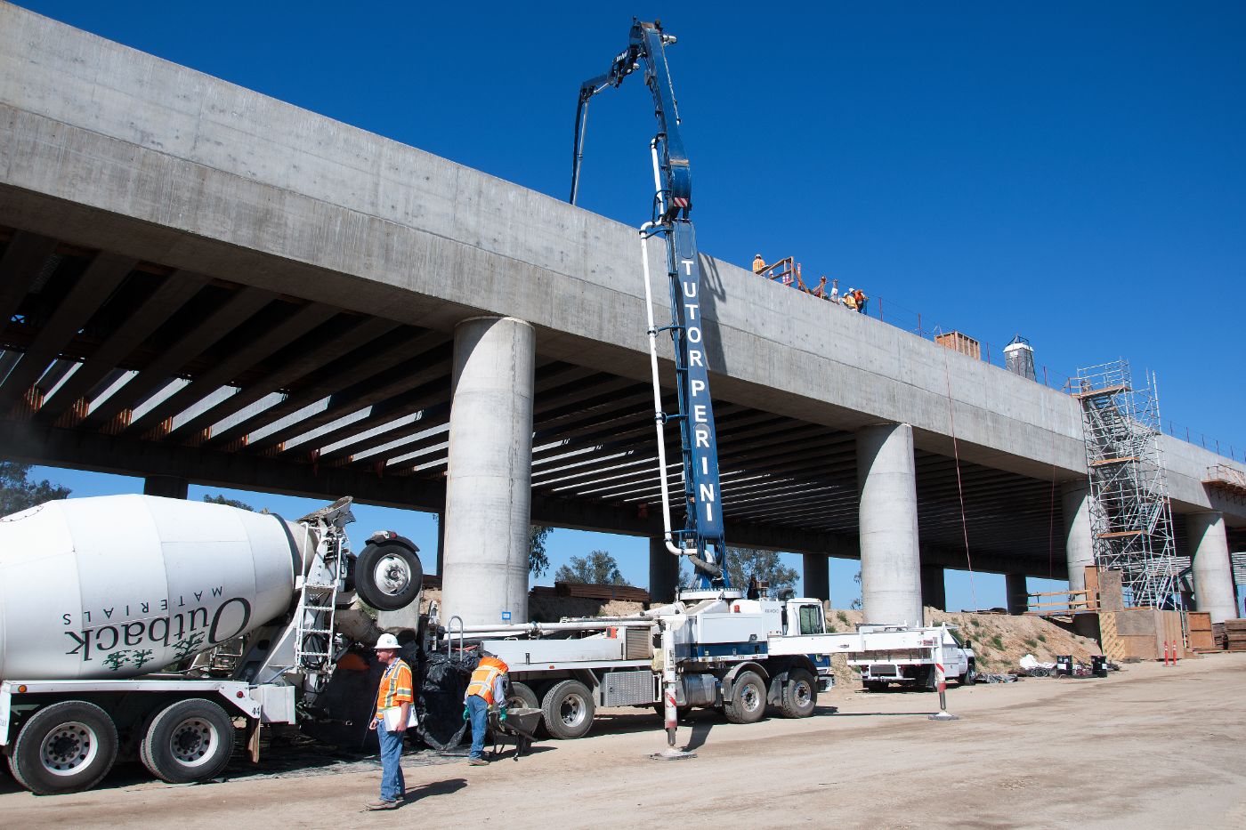 Design-builder Tutor-Perini/Zachry/Parsons (TPZP) is using precast spliced girders for the superstructure to achieve the distances needed. Shorter precast girders are set on temporary falsework bents. The girders are then post-tensioned and the ends enclosed in concrete to unify the superstructure. Ultimately, the bridge will be over 700 feet long with the longest span stretching 198 feet.