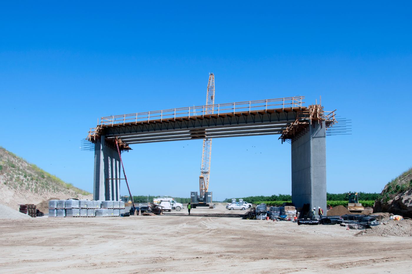 At Avenue 11, just east of Road 30 ½, the abutments for the overpass have been completed and bridge girders have been set. Crews are now beginning to form the bridge deck for this structure, which will take traffic over the high-speed rail alignment. A crane is seen lifting pre-cast concrete bridge deck panels onto the structure where they are carefully guided into place. Once the deck panels have been installed, the ironworkers will lay the deck steel. Next, carpenter and laborer crews will move in to form the edge of the deck and prepare for a concrete pour. Other crews have finished the block walls, which will retain the earthen embankment extending from the abutments.