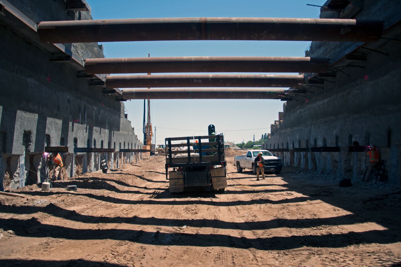 At the Fresno Trench beneath State Route 180 (SR 180), construction begins on multiple elements of the trench. The excavation and shotcrete operation beneath SR180 is ongoing. Crews have excavated approximately 40 feet below the top of the freeway. To the north of SR 180, craftworkers are busy constructing the intrusion barrier walls. The barrier wall will separate the high-speed rail alignment from the existing freight rail that parallels the project. The wall will be 10 feet tall, three feet thick and extend nearly 1,200 feet in this area of the project and nearly 20,000 feet project wide. When complete, the trench will cross under SR 180, a rail spur and the Dry Creek Canal.
