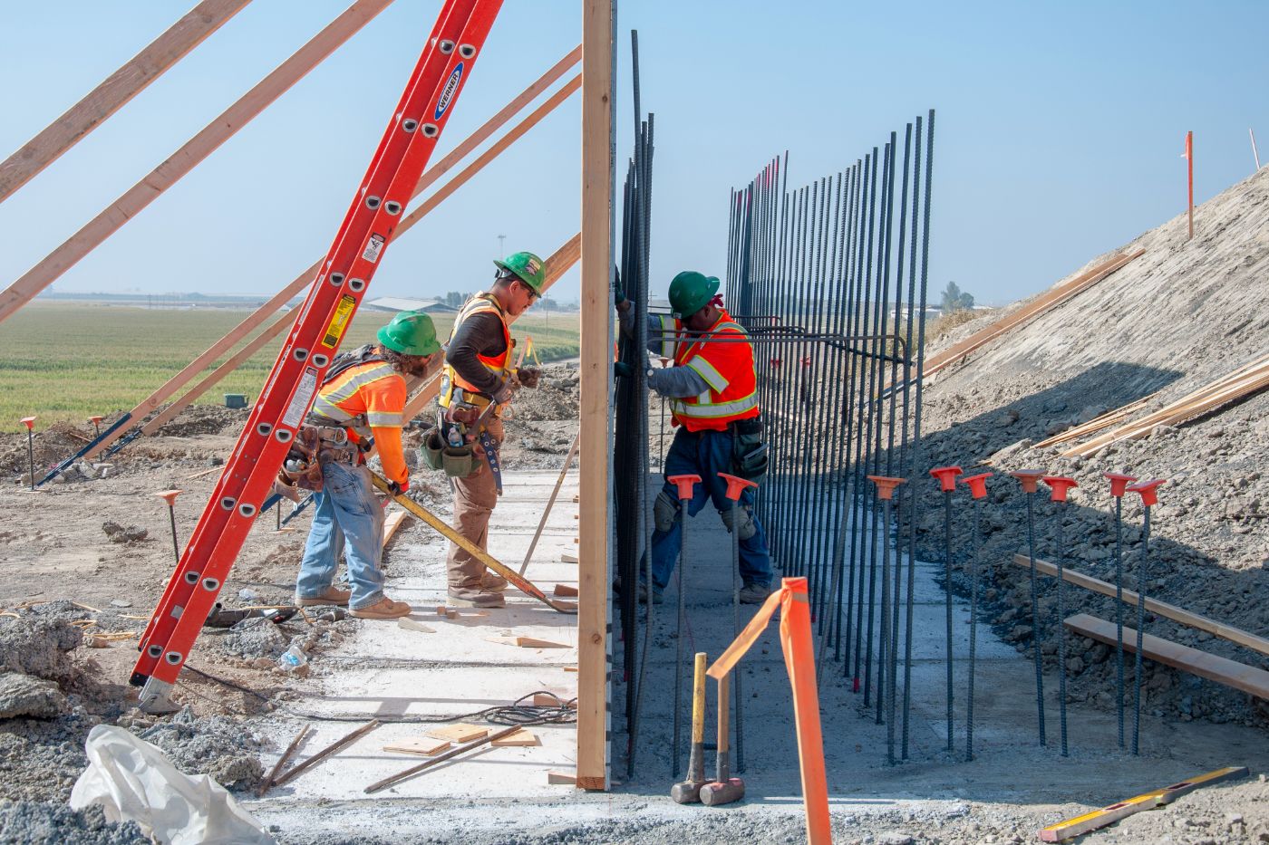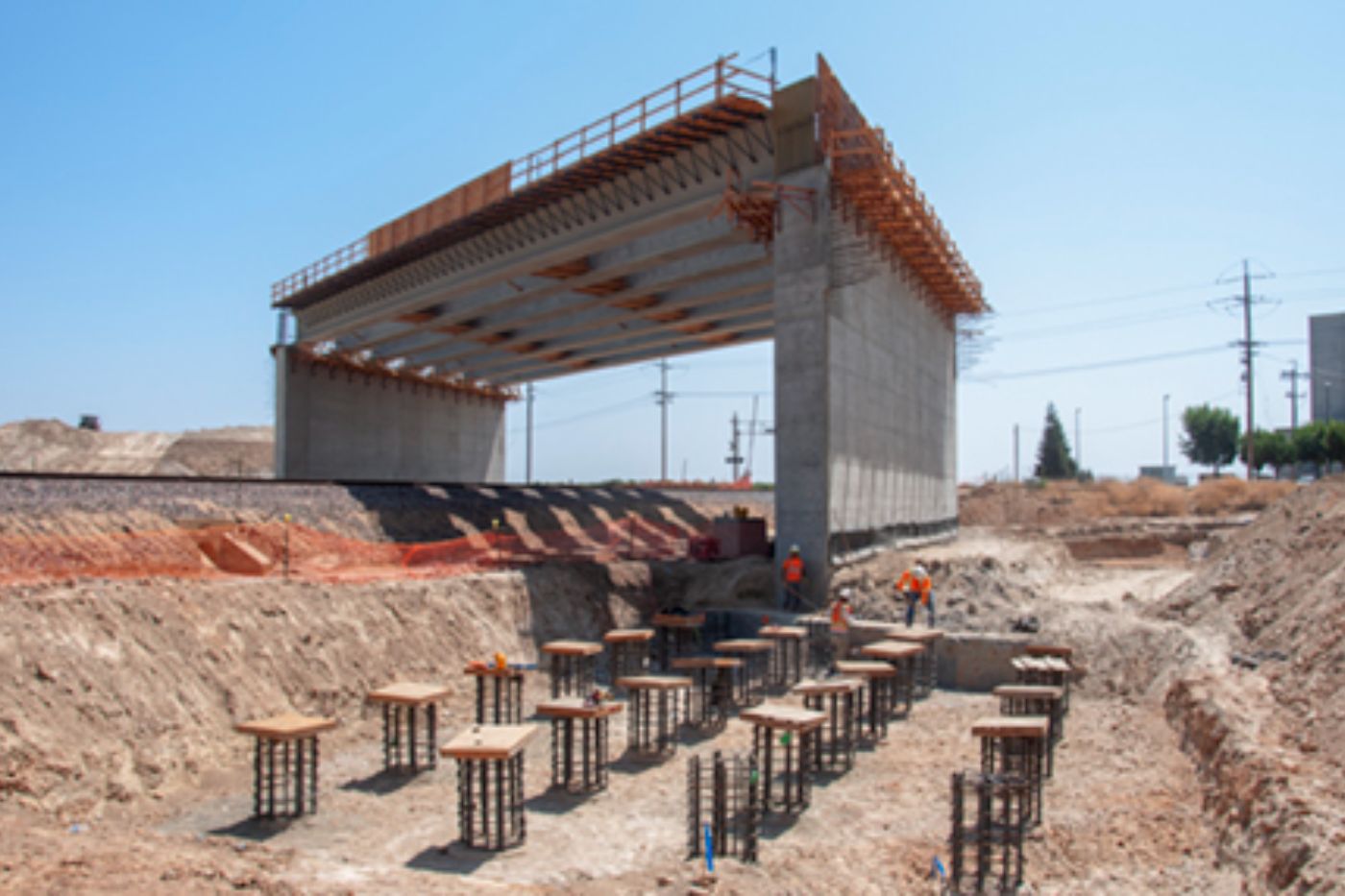 Construction of two overcrossings in CP 2-3 continues with the installation of concrete forms and tying rebar for abutments. At the crossing for Kansas Avenue west of State Route 43, crews tie rebar for columns that will be lowered into drilled shafts and filled with concrete to form the foundation for an abutment. About a mile north, at Kent Avenue, another crew sets concrete forms to begin the construction of an abutment.