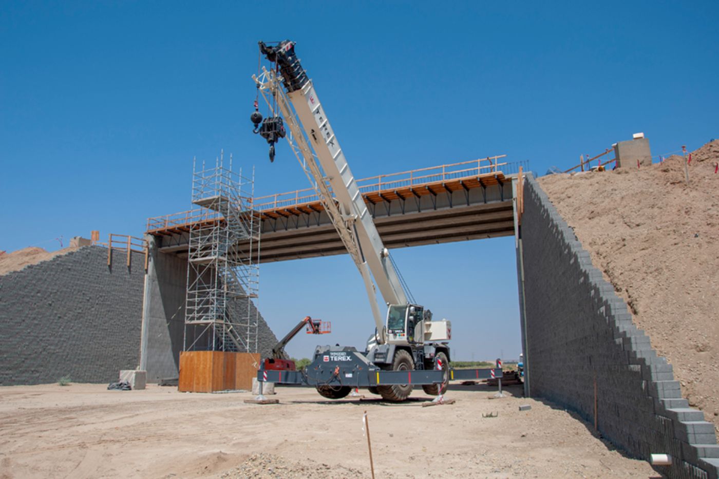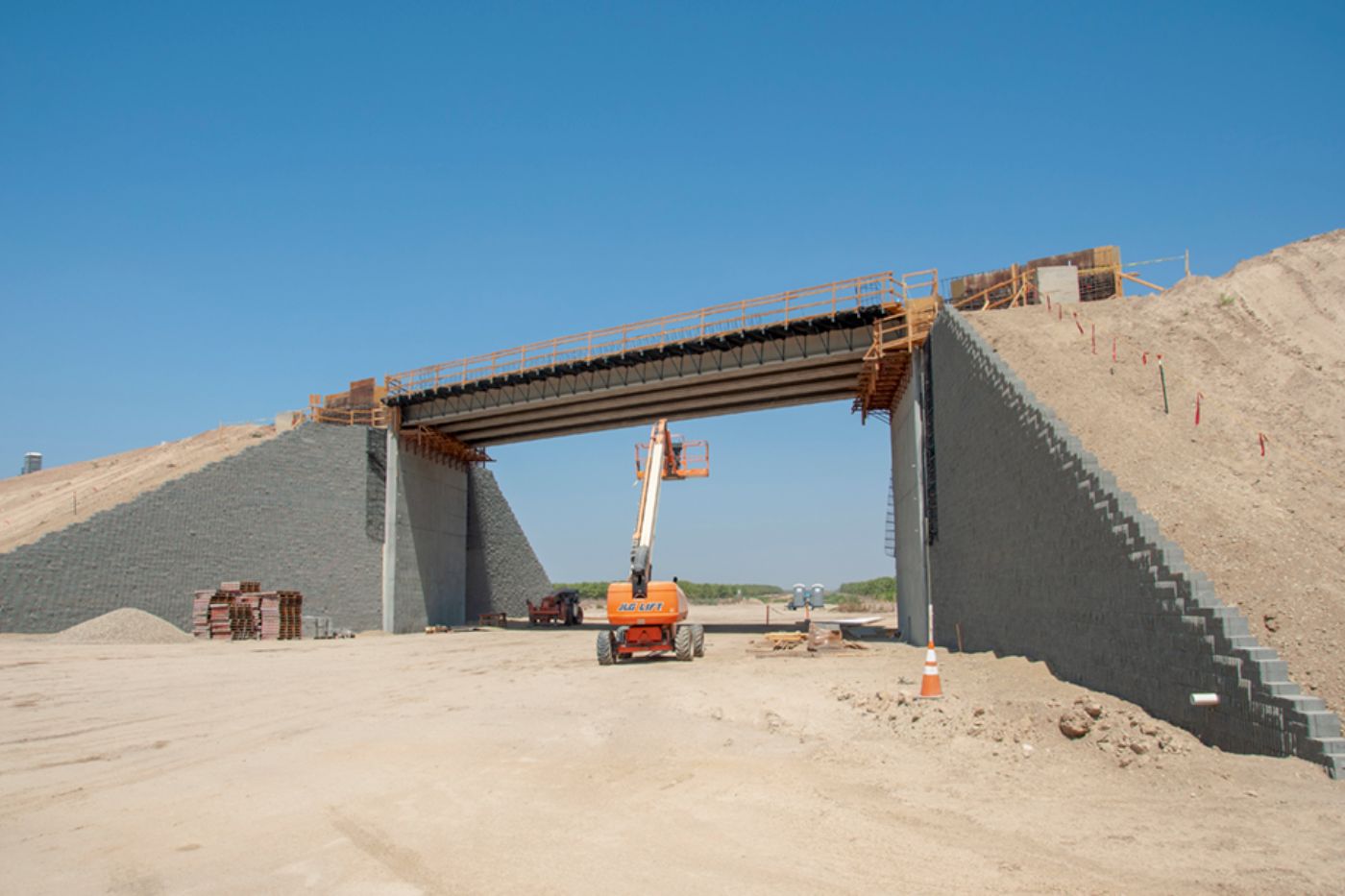 At Avenue 8 in Madera County, rebar is in place for a single span bridge east of State Route 99. Crews are working on the bridge wing walls and bridge deck rebar. The block retaining walls have been completed on either side of the abutments and fill dirt placed to finish the slope leading up to the bridge.