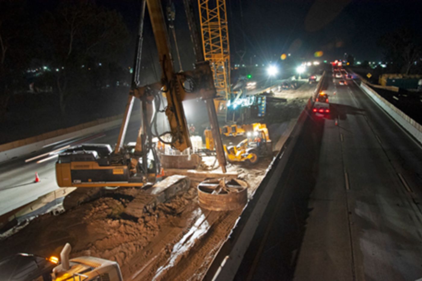 At the Cedar Viaduct, construction crews continue extending the structure across State Route 99 south of Fresno. Concrete support piers are being constructed on either side of the highway and in the highway median as well. Drill shafts have been poured and column work is beginning. The viaduct will eventually be connected to the smaller Muscat Viaduct a little further to the south. One of the largest structures on Construction Package 1, the Cedar Viaduct will be about three-quarters of a mile long when it’s complete.