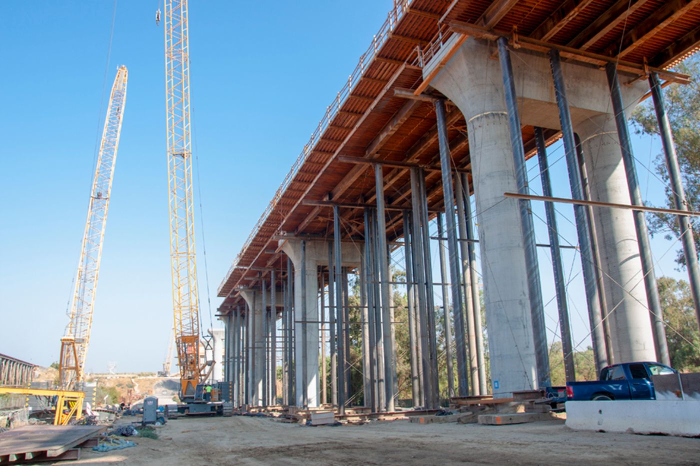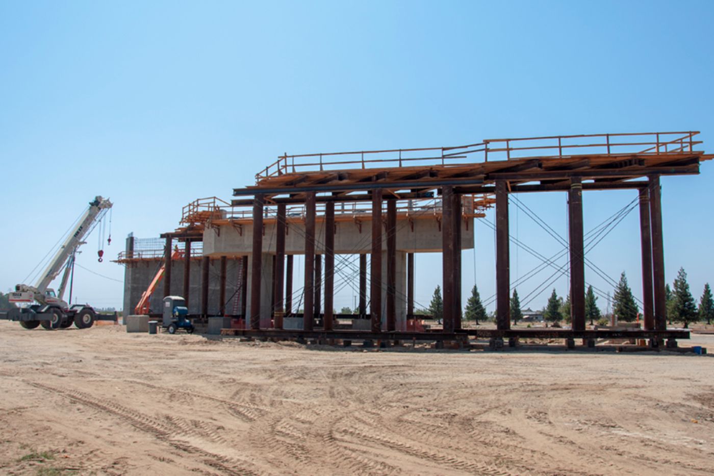 At the San Joaquin River Viaduct, workers have completed concrete pours for much of the pergola deck that will carry high-speed trains over the existing rail line (above). On the south bank of the San Joaquin River, crews are finishing up construction of the remaining support columns, while on the north bank of the river (below), the final pier cap has been poured. The cast-in-place construction of the deck is progressing and will follow with the completion of the pier caps, tying all the individual components of the structure together. The completed viaduct will form one of the largest structures on this first phase of the high-speed rail project.