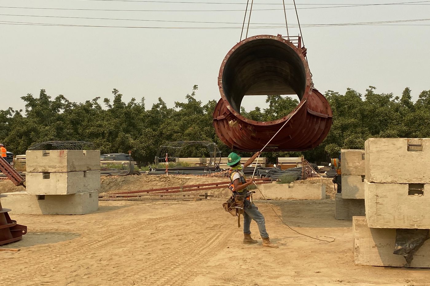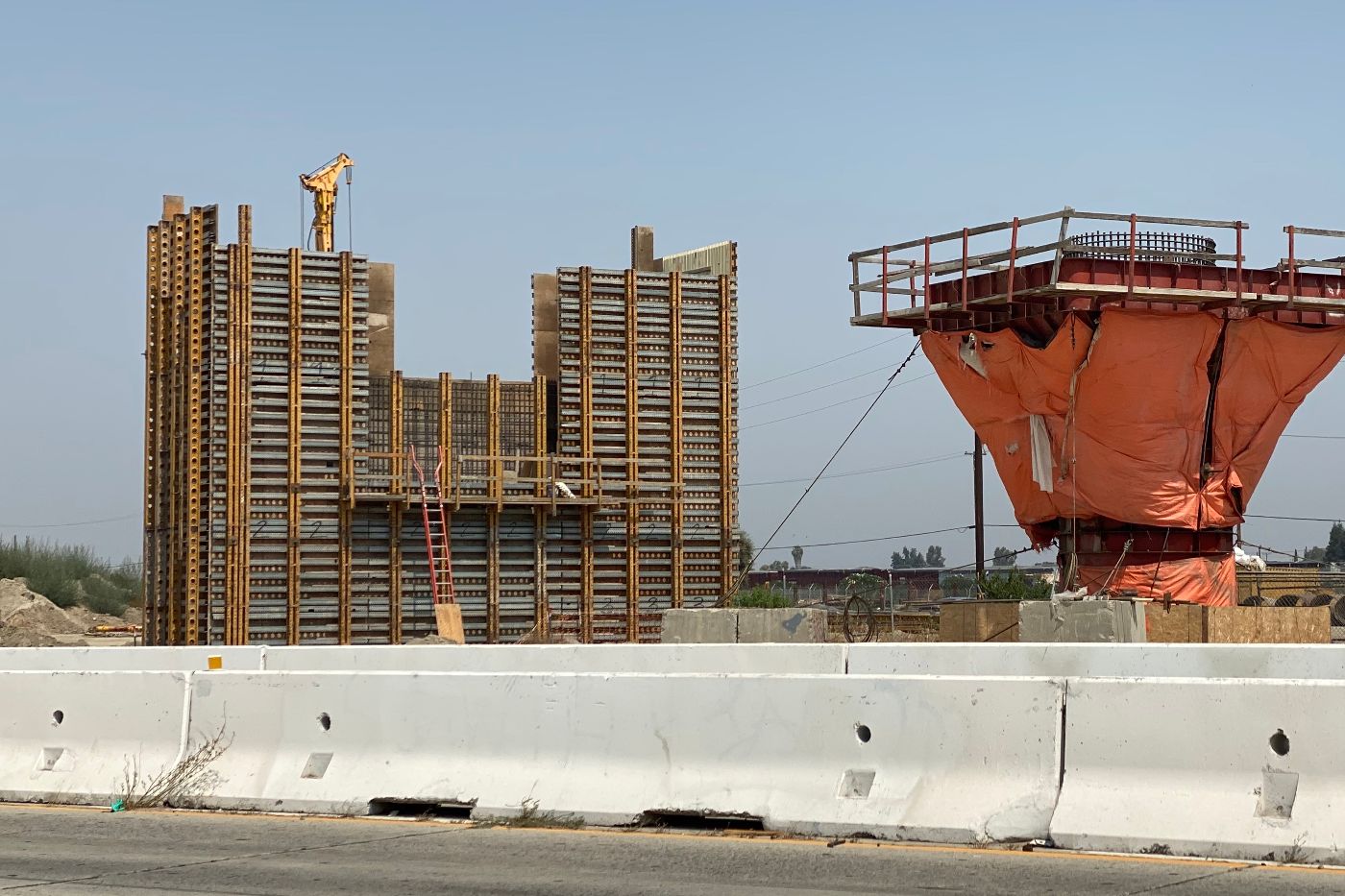 At the northern segment of the Hanford Viaduct near Grangeville Boulevard, crews continue to erect the concrete columns needed to support the top of the structure. Crews continue to work north to south, hoisting the forms for the columns into place toward the middle section of the viaduct before concrete is poured to form the column.