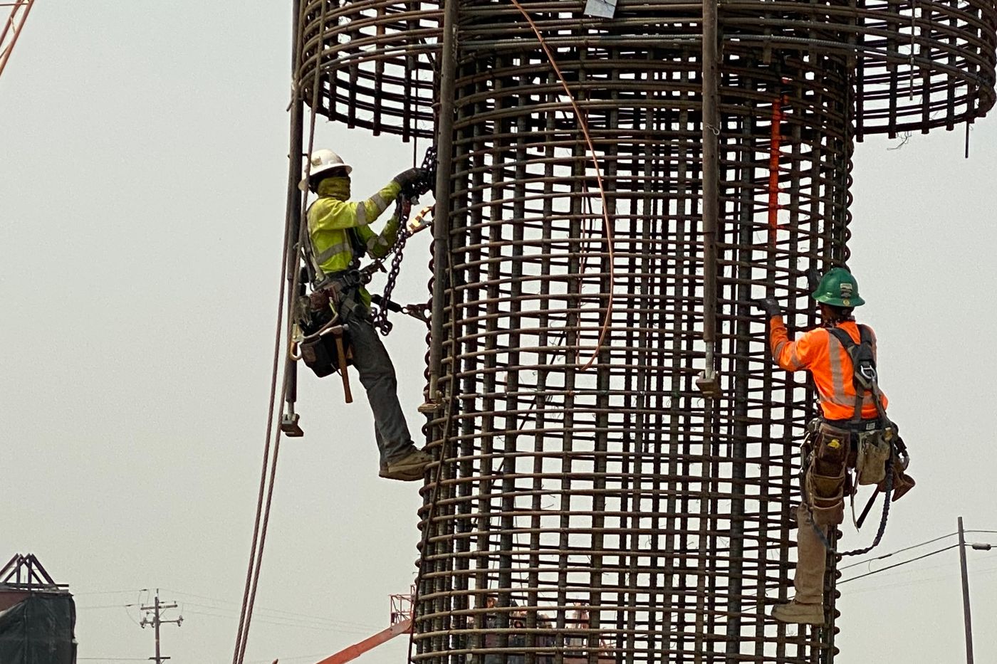 On the west side of the BNSF tracks, 18 of the 24 columns have been erected. Crews are now working on pouring concrete to form the column flares, the portion of the column that supports the structure. All column rebar cages should be fabricated and placed in the coming weeks.