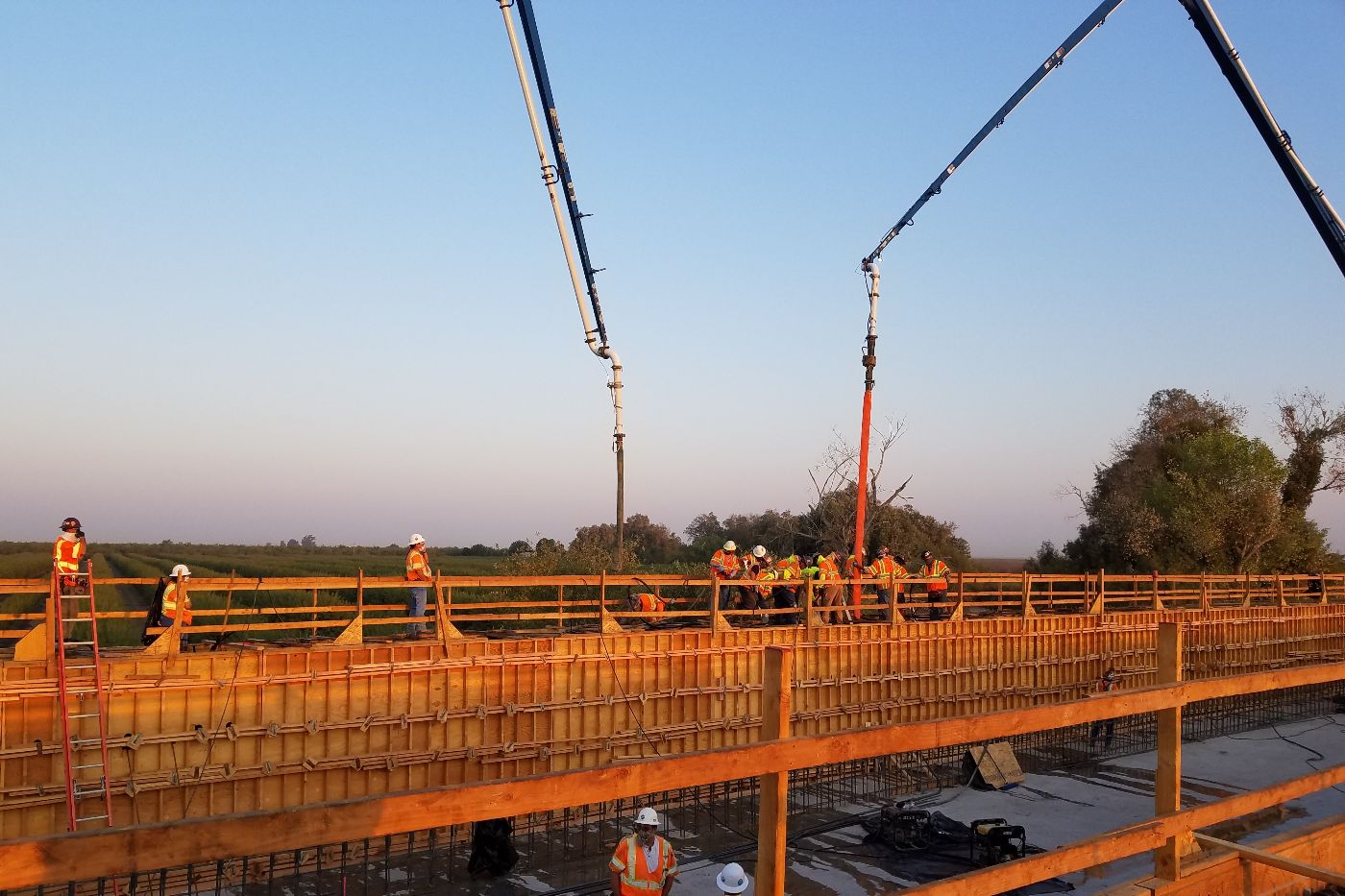 North of Wasco in Kern County, crews placed nearly 431 cubic-yards of concrete to form the deck of the Pond Road Viaduct. The job took 8 hours to complete and was the second concrete placement at the structure. The week before, crews placed 66.5 cubic-yards of concrete to form the diaphragms. The Pond Road Viaduct will span approximately 121 feet in length, 52 feet wide, and will allow high-speed trains to cross over Pond Avenue.