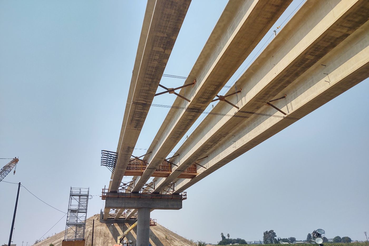 In July, crews shut down State Route 99 (SR 99) overnight to place the last two precast girders to form the superstructure of the Cedar Viaduct. Ironworkers continue to tie rebar for the edge beams of the structure. When complete, the Cedar Viaduct will be nearly 3,700-feet long and will carry trains over SR 99, North and Cedar Avenues, and Golden State Boulevard.