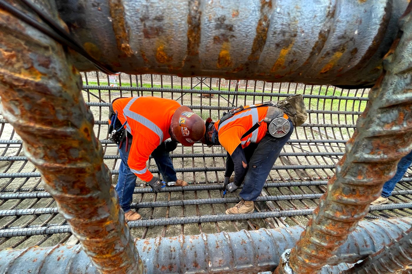 This month, ironworkers at the Conejo Viaduct continue to assemble rebar cages that will be used to form the columns of the viaduct. The rebar cages are then lifted and placed in cast-in-drilled-holes (CIDH) bents to provide future support of the structure. On the east side of the BNSF railroad, 26 columns will be needed for the structure.